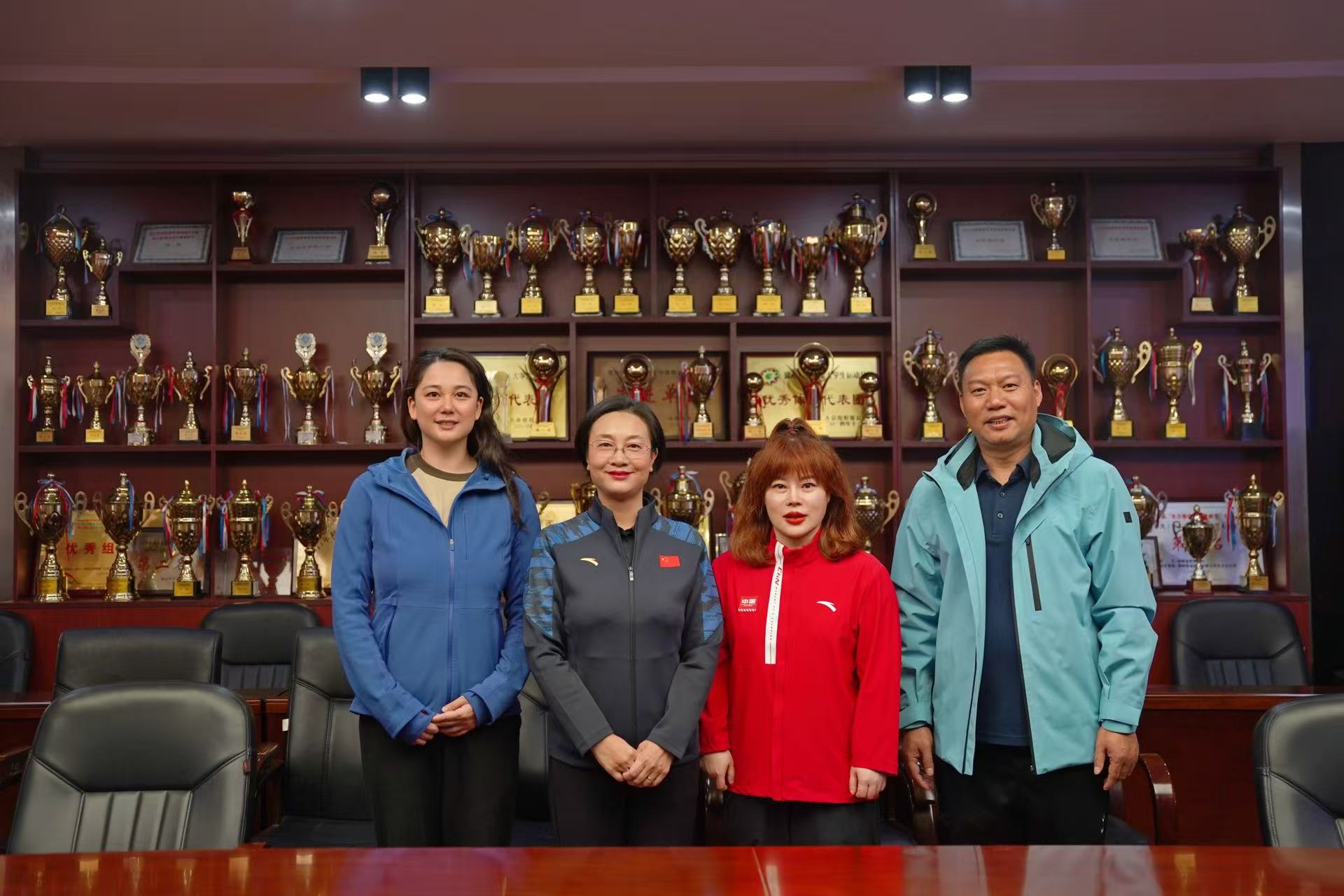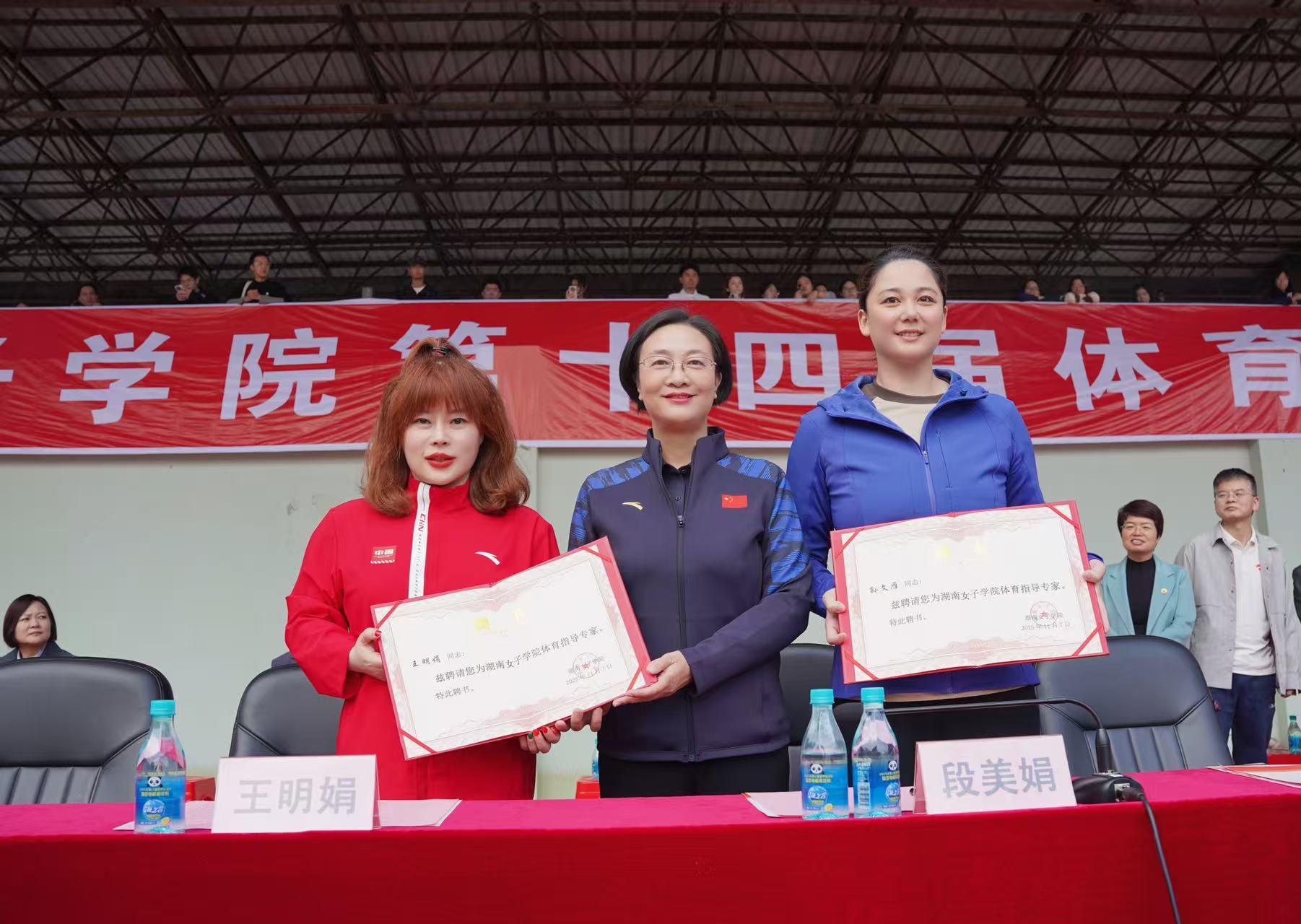 段美娟首先代表全校师生对冠军的到来表示最诚挚的欢迎和感谢,并简要介绍了湖南女子学院在体育教学、群体活动开展以及特色人才培养方面取得的成果。段美娟指出,世界冠军是国家的骄傲、民族的楷模,其身上所展现的顽强拼搏、超越自我、追求卓越的体育精神,与我校致力于培养“自尊、自信、自立、自强”女性人才的目标高度契合。此次邀请世界冠军进校园,参与体育盛会,旨在激励广大女院学子以冠军为榜样,将体育精神内化为刻苦学习、奋发向上的不竭动力。奥运冠军王明娟和世界冠军孙文雁对学校的热情接待表示感谢,并各自分享了自身训练和比赛的心路历程,讲述了金牌背后艰苦奋斗、永不言弃的故事。她们高度赞赏了湖南女子学院浓厚的体育氛围和师生们在运动场上展现出的蓬勃朝气与竞技风采,鼓励同学们不仅要注重文化知识的学习,也要积极投身体育锻炼,锤炼意志品质,实现全面发展。她们表示,能够参与湖南女子学院的体育盛会深感荣幸,希望她们的经历能激励更多青年学子勇敢追逐梦想。会谈气氛融洽而热烈。双方还就弘扬体育精神、促进青少年体质健康、推动体教融合等话题进行了深入交流。何旭娟表示,希望以此次交流为契机,未来能进一步加强与体育界的联系,引入更多优质资源,不断提升学校体育育人水平。开幕式上,段美娟为两位世界冠军颁发了体育指导专家聘书。