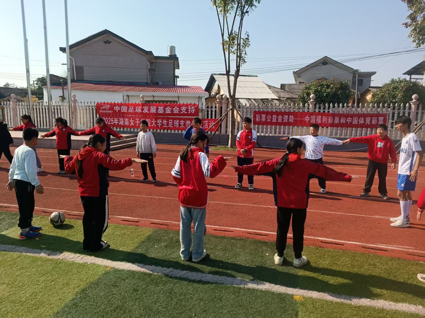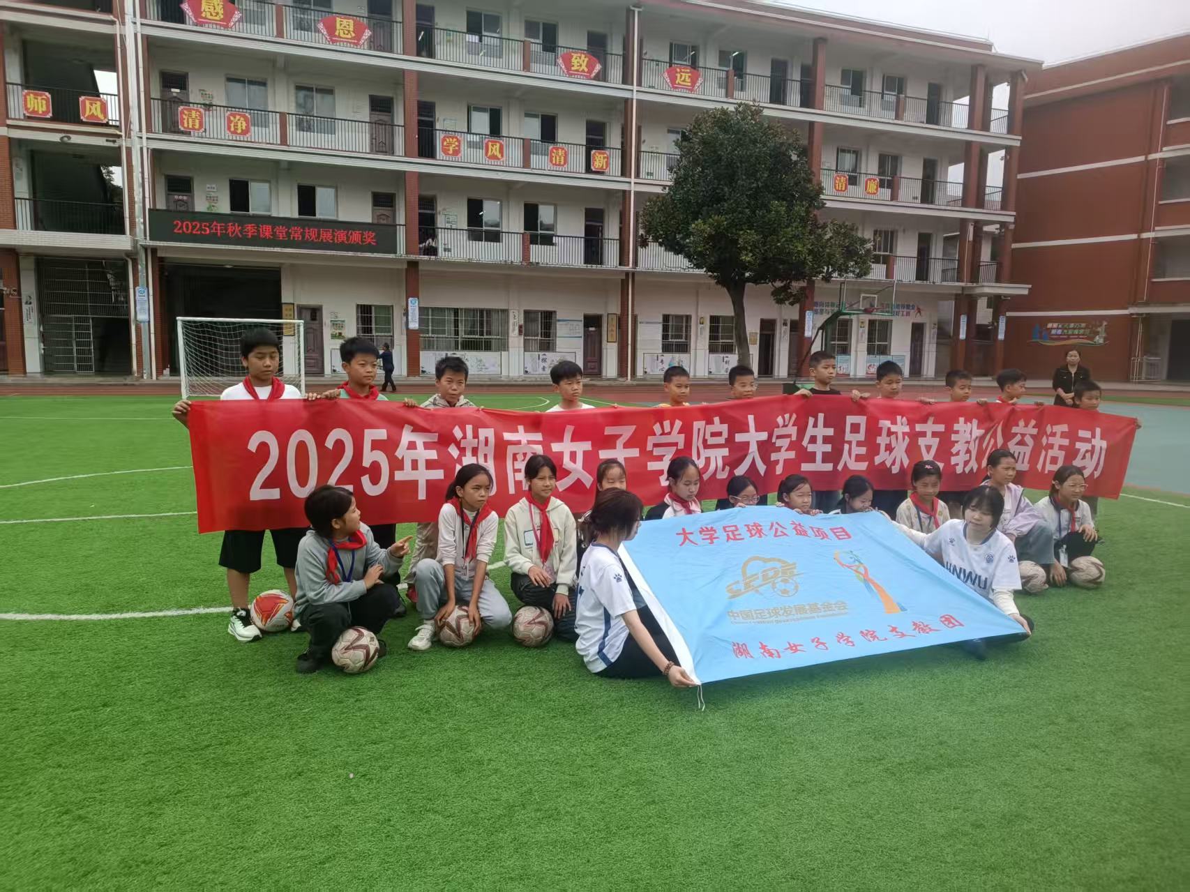 本网讯(体育部 李照清)在中国足球发展基金会资助、中国福利彩票和中国体育彩票公益金支持下,湖南女子学院“2025年大学生足球支教公益项目”于11月28日在新晃侗族自治县顺利收官。9月底启程的张宁楠、武芊芊等8名志愿者扎根思源实验学校、林冲镇学校、鱼市中心小学、芙蓉学校四所乡镇校60天,把晒谷坪、鼓楼前变成“流动球场”,用矿泉水瓶摆杆、布条标志碟、粉笔划线,为近千名侗乡娃带去足球初体验。支教大纲对标校园足球指南,拆解出“穿越侗寨”运球接力、“盲传信任”配合游戏、“颠球王”擂台等二十余个趣味模块,让零基础孩子也能在笑声中完成第一次带球突破;同时开设“女足精神讲堂”,讲述中国女足逆转故事,鼓励侗族女孩自信奔跑。志愿者们坚持男女混编、分层教学,陆续组建多支年龄段梯队,选拔出一批“希望小球星”,女生占比近半,有效激发山区女孩的运动热情。